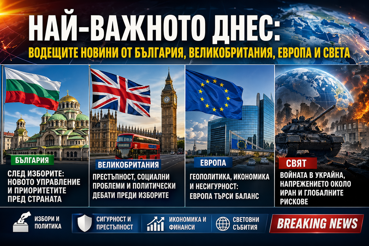 Днешният новинарски поток очертава картина на динамично пренареждане – както вътрешнополитическо в България, така и геополитическо на глобално ниво. След изборите у нас, ескалацията на войната в Украйна и напрежението около Иран, светът навлиза в период на повишена нестабилност и стратегически решения.